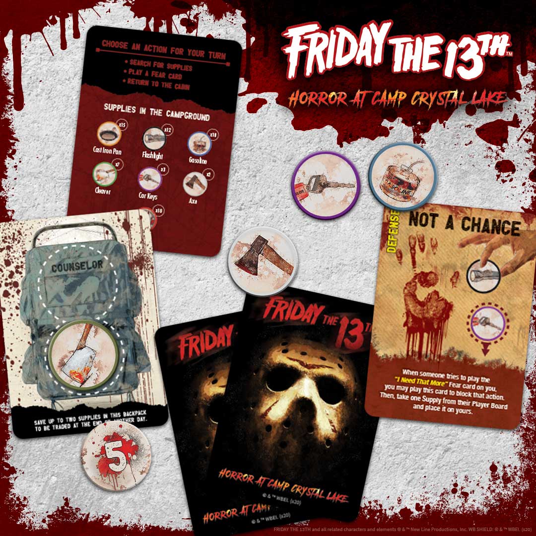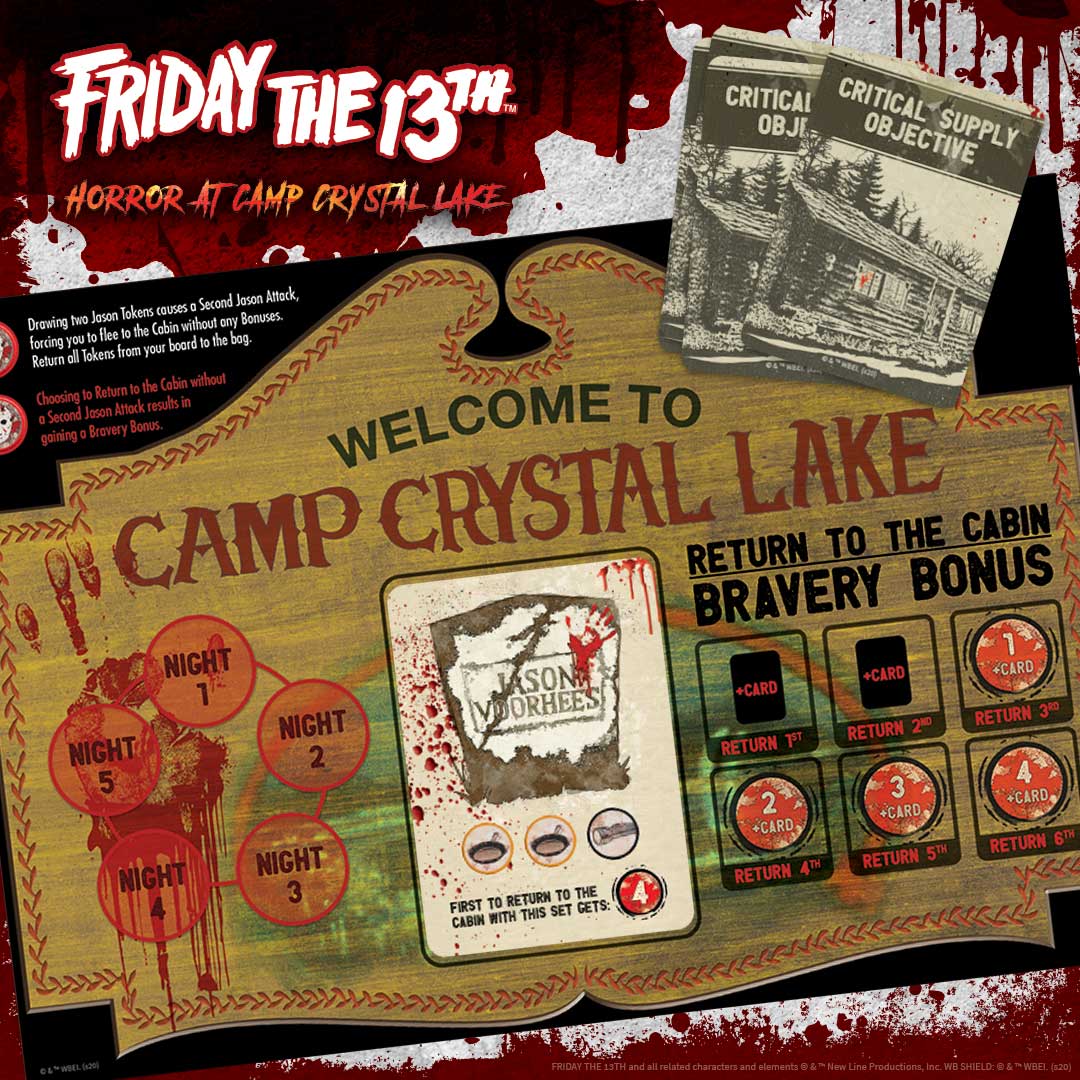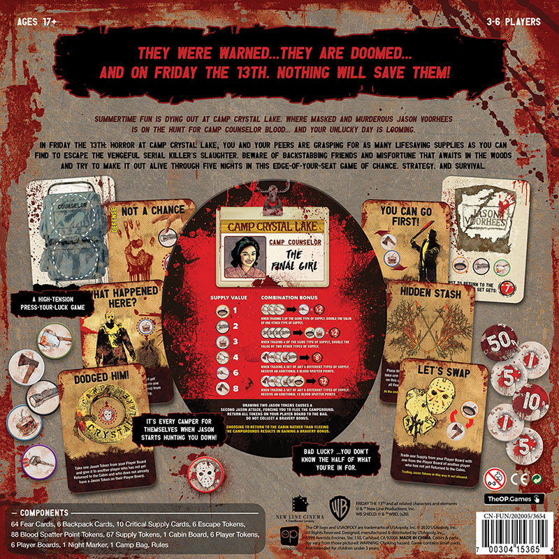 Summertime fun is dying out at Camp Crystal Lake, where masked and murderous Jason Voorhees is on the hunt for camp counselor blood? and your unlucky day is looming. Grasp for as much lifesaving supply as possible to escape the vengeful serial killer’s slaughter and try to make it out alive through five nights in this edge-of-your-seat game of chance, strategy, and survival. Reach into the bag and see what you will find!
