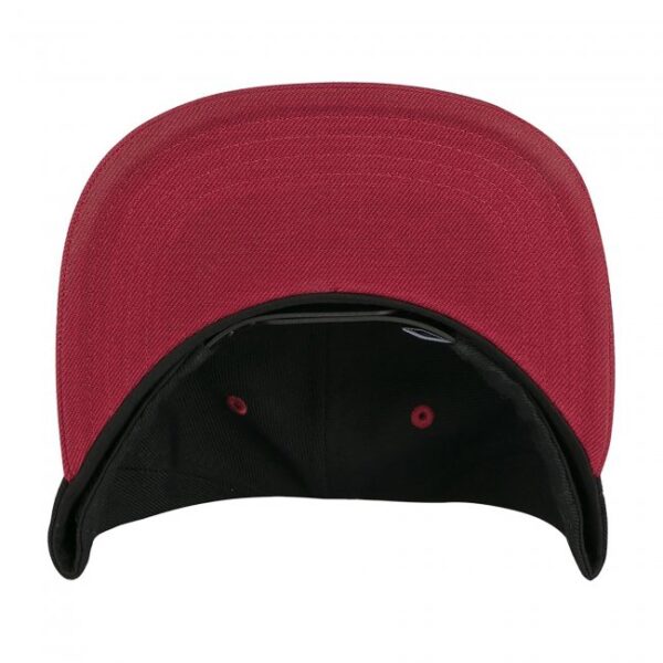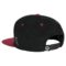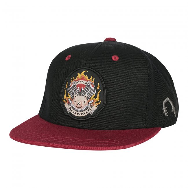 Black snapback hat featuring Roadhog tattoo patch embroidered on front of cap; Roadhog hook embroidered on side; contrasting red brim and eyelets